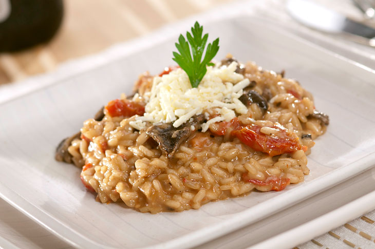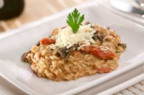 (mignon grelhado com tomate seco; acompanhado de risoto ao gorgonzola e aspargos)