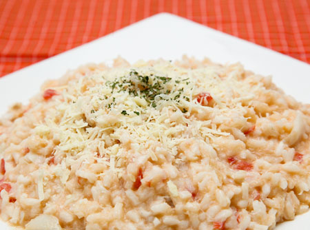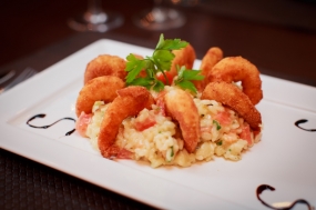 Camarão a milanesa recheado com pasta de queijos e ervas; acompanha risoto champanhe e uvas passas.
