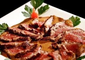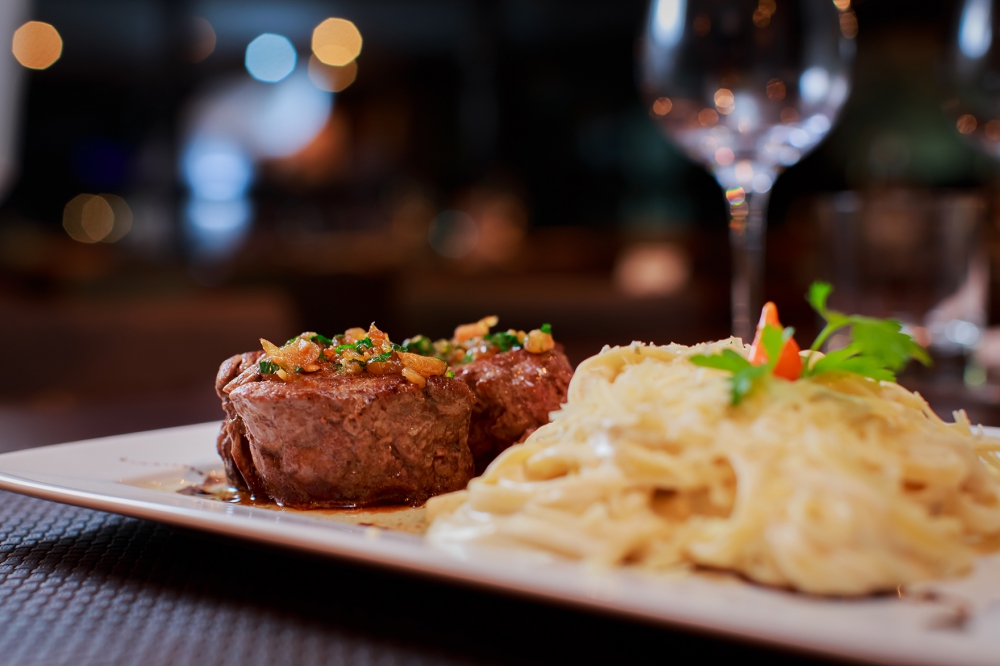 (mignon grelhado ao molho de azeite de oliva, alho desidratado e ervas; acompanha talharim na manteiga e creme de leite)