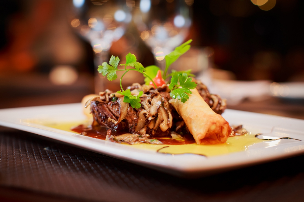 Acompanhamentos: Strudel de nozes e queijos, molho ponzu e manteiga de laranja
