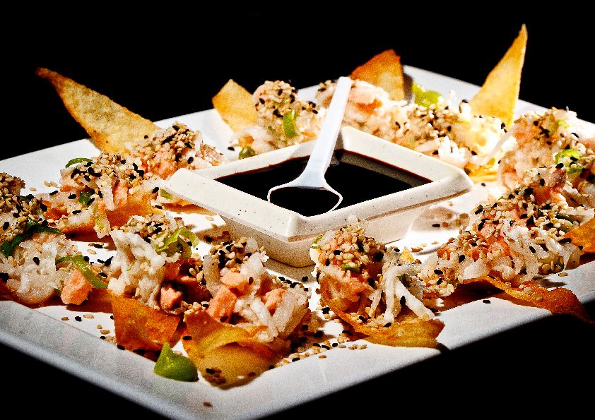 (folhas verdes, manga, pepino japonês, kani-kama, vinagrete de gengibre e curry)