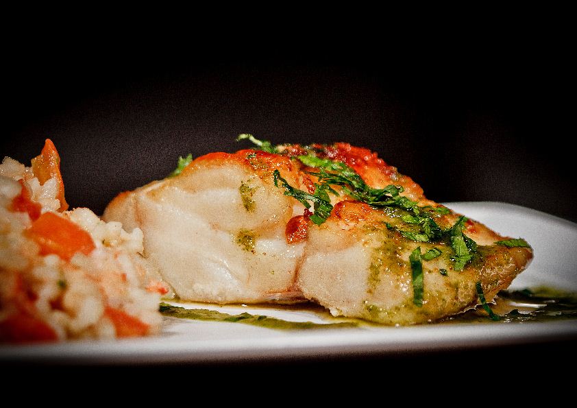 Congrio grelhado com molho mornay, camarões, alcaparras, cogumelos e requeijão, acompanha arroz branco.