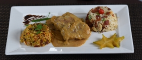 (mignon grelhado ao molho de pimentas verdes e creme de leite; acompanha arroz e batatas sauté)