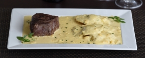 (mignon grelhado com molho de redução de estragão e vinagre, gema e creme de leite; acompanha risoto a milanesa)