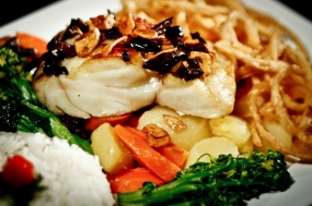 Bacalhau grelhado ao molho de azeite de oliva e alho, acompanha legumes, batatas cozidas e anéis de cebola a dorê.
